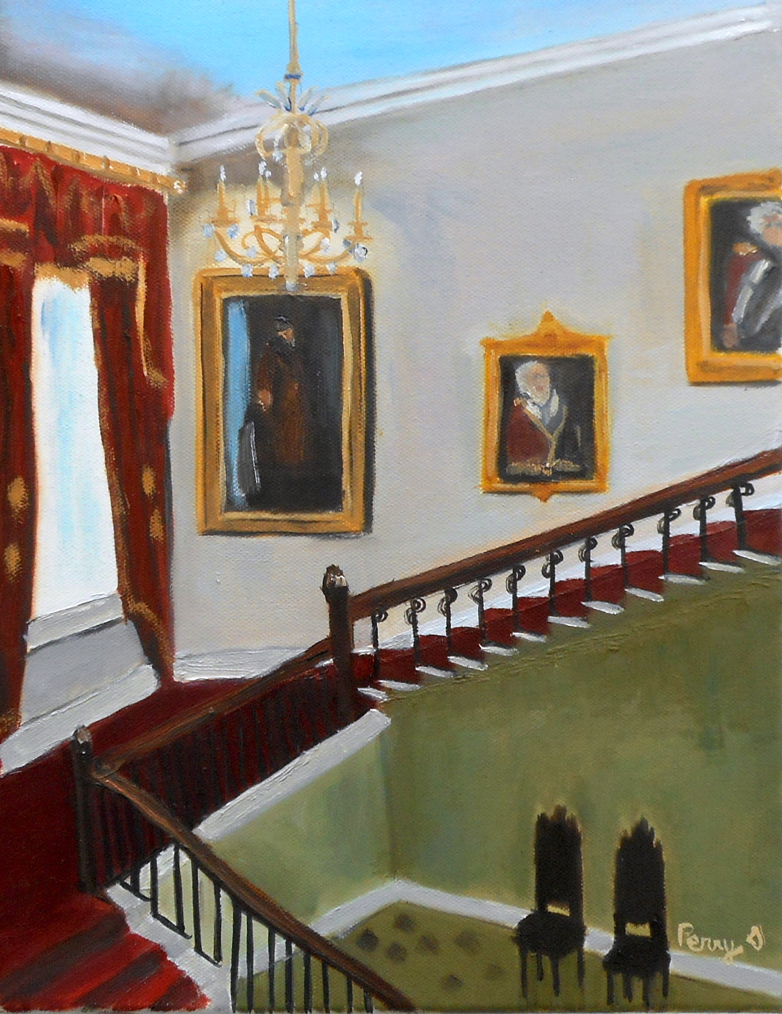 This 11 x 14 painting is from our visit to The Royal Ireland Palace in Dublin. It was on our last day of our trip and we were supposed to go on a tour of The Barlney Castle but we over slept. We stayed in Dublin and just had a wonderful day regardless. Went to the Natural History Museum had a great lunch and viewed the Palace. I love doing interiors. This painting has so much character because most people never get to see that area. It is in a black plein air frame.